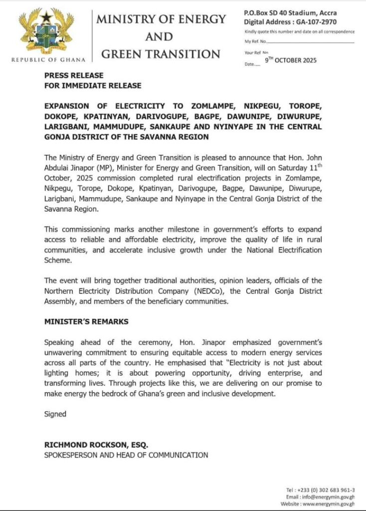 Savannah, October 9, 2025 – The Ministry of Energy and Green Transition has announced the completion and commissioning of new rural electrification projects across fourteen (14) communities in the Central Gonja District of the Savannah Region.