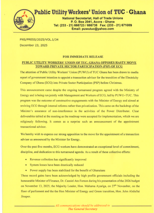 The Public Utility Workers’ Union (PUWU) of the Trades Union Congress (TUC), Ghana, has kicked against what it describes as a hasty move by the government to push the Electricity Company of Ghana (ECG) toward private sector participation (PSP), warning that such a decision risks undermining an ongoing turnaround programme that is already yielding results.