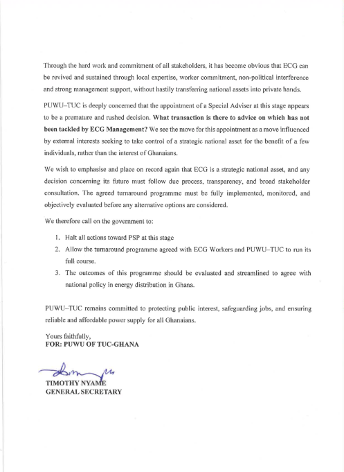 PUWU-TUC has consequently called on the government to halt all actions toward private sector participation for now, allow the turnaround programme to run its full course, and subject its outcomes to proper evaluation in line with national energy distribution policy.