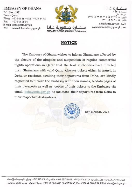 The Embassy indicated that the information will enable it to coordinate with relevant authorities to assist impacted Ghanaian travellers in leaving Doha once arrangements are made.