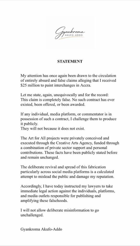 Former Executive Secretary of the Creative Arts Agency’s Gyankroma Akufo-Addo has strongly denied allegations that she received $25 million to undertake painting works on interchanges in Accra, describing the claims as false and misleading.